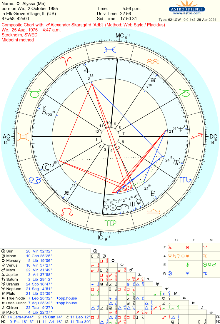 To make explanations easier I have put my birth chart with Alexander Skarsgård’s birth chart, to create our composite chart. BTW, I am writing this article, so I am allowed to pair myself up with anyone I feel like.
